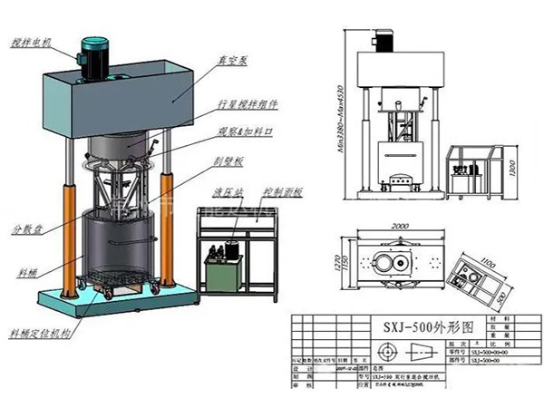 雙行星混合攪拌機(jī)是一種對(duì)多種液體、粉體進(jìn)行混合攪拌、溶解、分散、均質(zhì)的攪拌設(shè)備,分為減速電機(jī)、封蓋、行星架,高速、低速、活動(dòng)刮板三軸,刮壁器、料桶、雙柱液壓升降系統(tǒng)、真空系統(tǒng)以及機(jī)架等構(gòu)成。雙行星混合攪拌機(jī)能在真空下工作,可不斷的排出水分和其他的揮發(fā)物,因此,可作為脫氣釜使用。料桶可根據(jù)需要采用油、水循環(huán)加熱或冷卻;也可使用蒸汽加熱。加熱溫度通過控制面板上的溫度控制儀顯示。行星分散混合機(jī)(行星攪拌機(jī))廣泛應(yīng)用于高粘度電池、涂料、有機(jī)硅膠、油墨、染料、粘膠劑等。